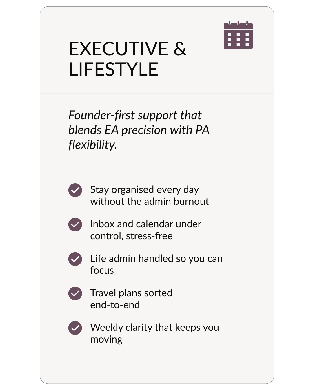 Helping founders with trusted, long‑term EA, PA, and operational support. Flexible, remote, founder‑first assistance.