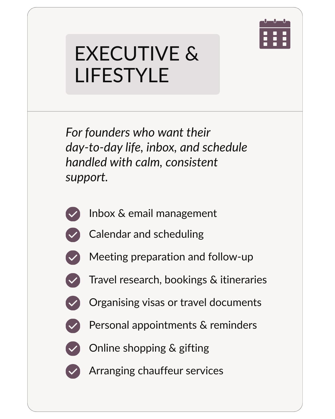 We cover a wide range of executive, operational, and client‑facing tasks. Explore the categories below to see how our support can be shaped around your business and lifestyle.
